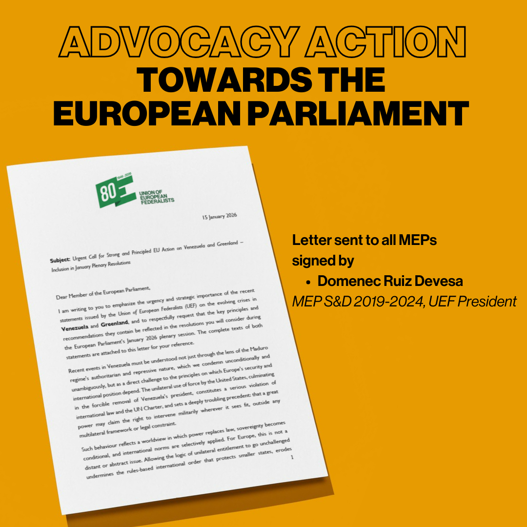 I am writing to you to emphasize the urgency and strategic importance of the recent statements issued by the Union of European Federalists (UEF) on the evolving crises in Venezuela and Greenland, and to respectfully request that the key principles and recommendations they contain be reflected in the resolutions you will consider during the European Parliament’s January 2026 plenary session. The complete texts of both statements are attached to this letter for your reference.