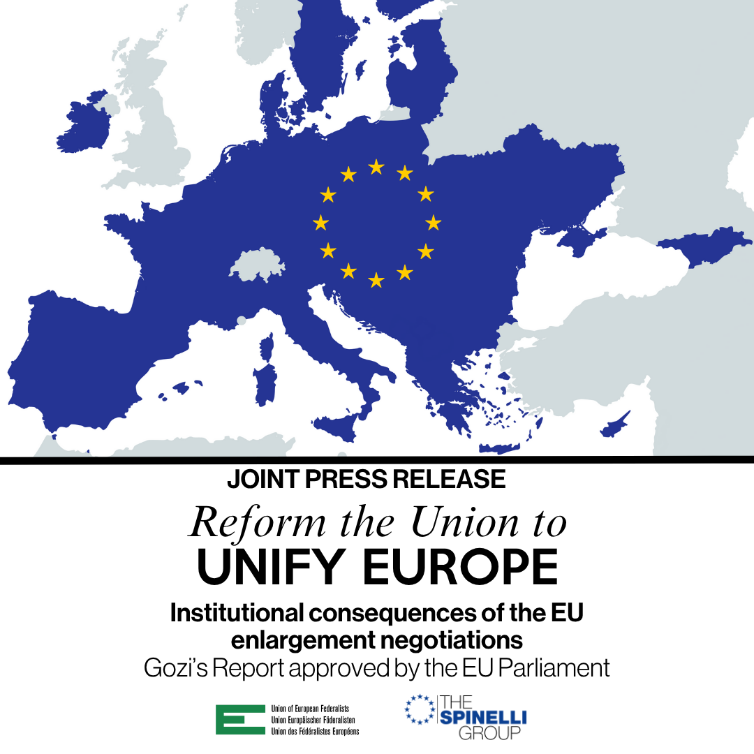 The Union of European Federalists (UEF) and the Spinelli Group welcome the approval by the European Parliament of the resolution on the institutional consequences of the EU enlargement negotiations, reported by Sandro Gozi MEP, former Chair of the Spinelli Group and Honorary President of the UEF.